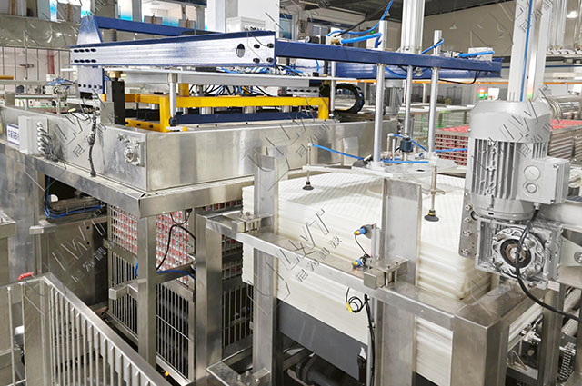自动装笼机→高温杀菌釜(121℃±0.5℃,温和杀菌,避免汤汁沸腾溢出,保留汤汁风味与营养)→自动卸笼机